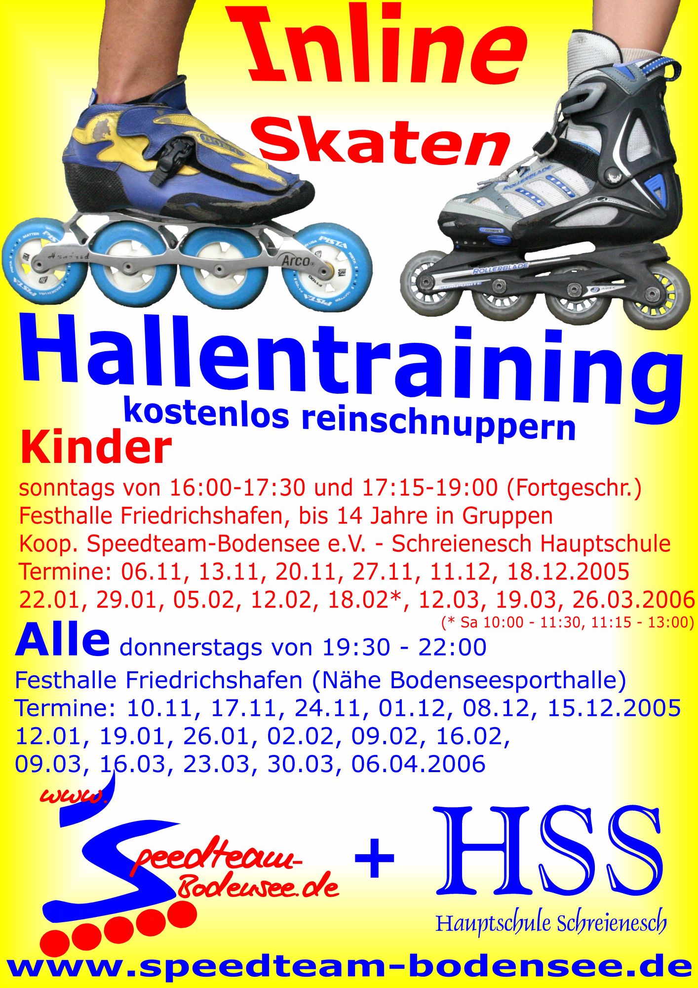 Für alle über 14 Jahre wird das Hallentraining wie schon in den Jahren zuvor angeboten. Treffpunkt ist immer donnerstags um 19:30 auf der "Empore" in der Festhalle. Nach kurzem Warmmachen ohne Skates geht es dann bis ca. 21:45 Uhr auf Skates in die Halle, so dass wir um 22:00 Uhr draussen sind.