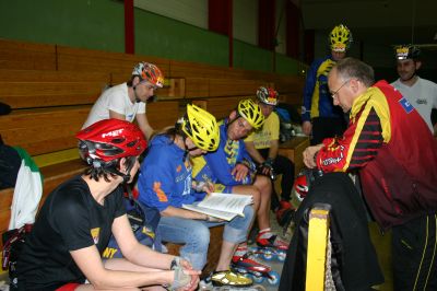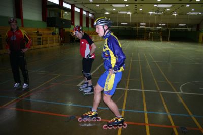 Dann durften wir endlich die Rollsporthalle, die einzige in Deutschland, einmal anschauen. Aber zuvor war noch ein Stündchen Theorie angesagt, denn ein echter Inline-Instruktor muss noch ein wenig mehr können als nur Skaten. Nun wissen wir auch wie das alles mit dem Verband so organisiert ist. Anschließend bekam jeder zwei Kärtchen auf denen Themen für die nächsten zwei Tage standen. Diese waren durchnummeriert und wurden zufällig verteilt. So hatte jeder zweimal seinen Einsatz um der Gruppe als Lehrer sein Thema beizubringen. Angefangen von Schützergewöhnung ging das bis zum rückwärts Übersetzen. Nachdem sich jeder so seine Gedanken und Notizen gemacht hatte durften die Skates geschnallt werden. Zum Warmwerden mussten wir natürlich in die Steilkurve. Den ganzen Tag über wurden Übungen gemacht, besprochen und von Bernd um sehr gute Übungen ergänzt. Eine Menge gute Ideen nahmen wir in unser Wohnwagenhotel, Etap Hotel, mit. Mit einem Spaziergang über den Weihnachtsmarkt und einem australischen Essen endete der Samstag.