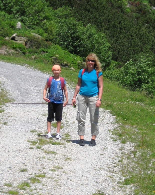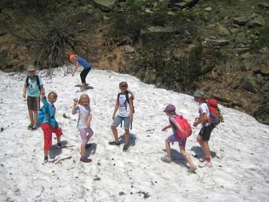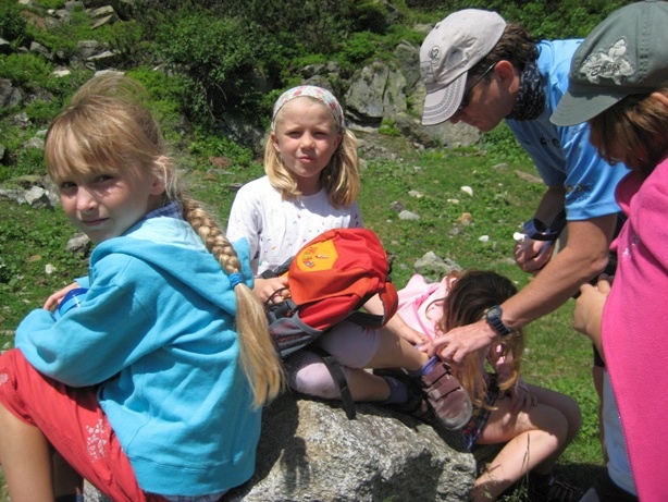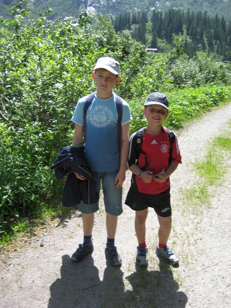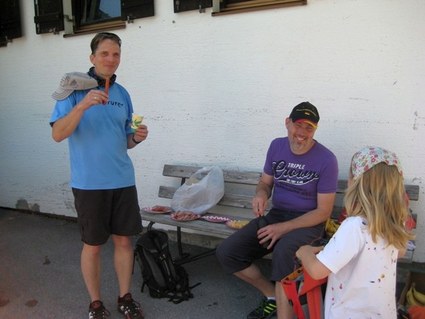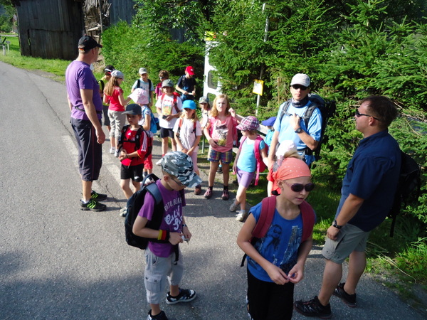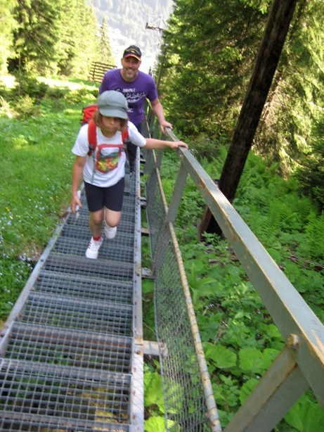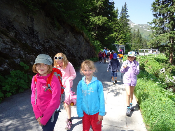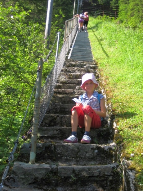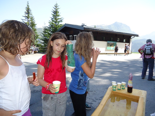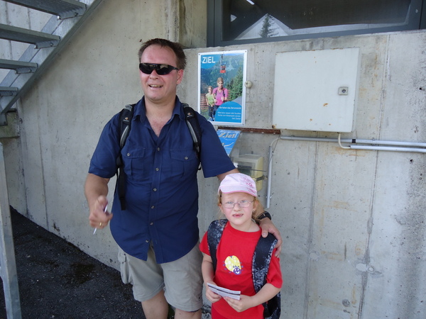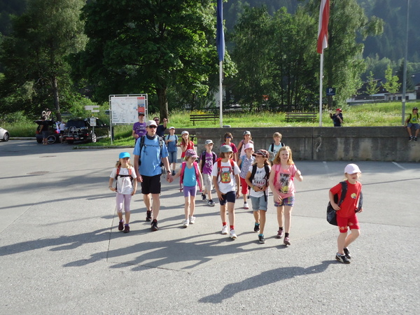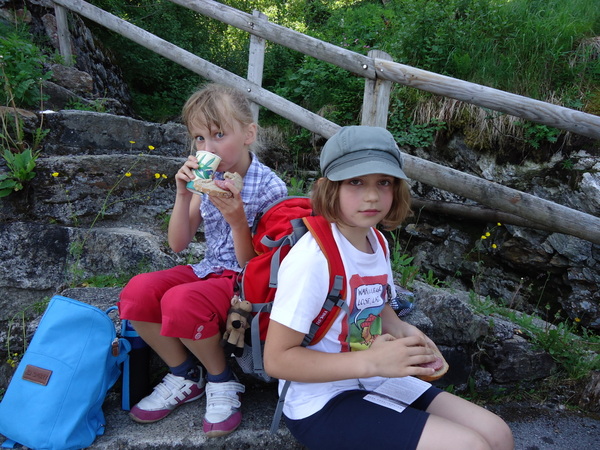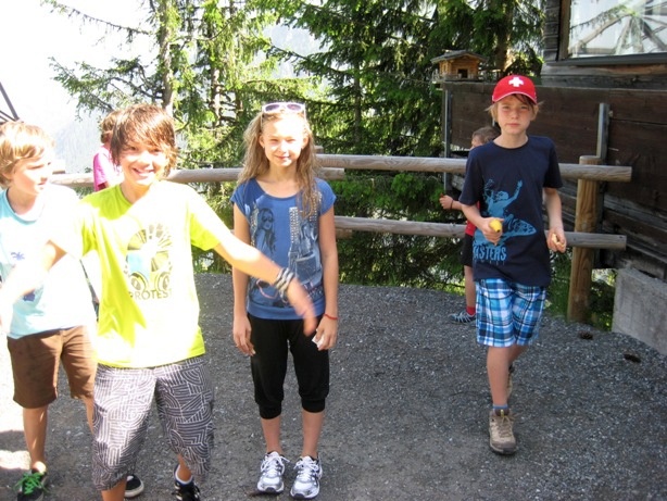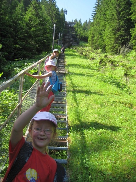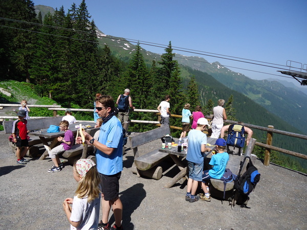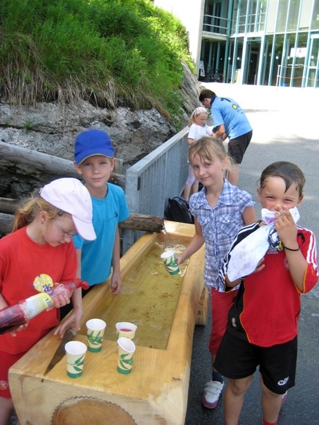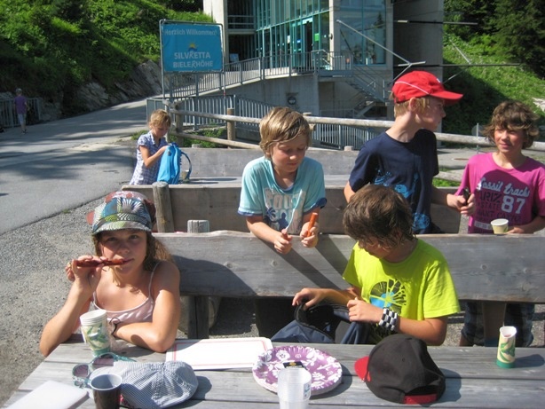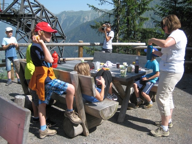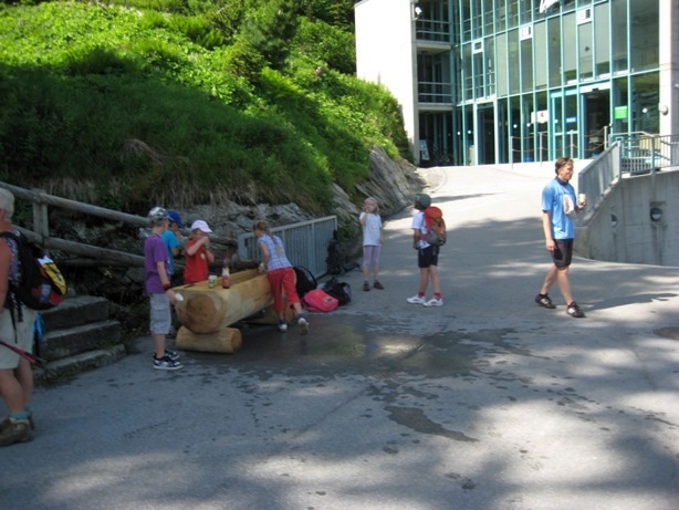 Gegen 7.00 Uhr trieb es am nächsten Morgen dann schon die ersten wieder aus den Federn und bei tollem Sonnenschein stürzen sich alle auf Melles kräftigendes Spezialmüsli. Es war wichtig eine gute Grundlage zu schaffen, denn auf uns wartete die Europatreppe mit ihren 4.000 Stufen, ihrer 86%igen Steigung verteilt auf 1.500m Metern Länge und 750 Höhenmetern. Mit dem Bus an den Fuß der Vermuntbahn in Partenen gebracht stempelte jedes Kind seine Karte ab und wollte natürlich in einer möglichst schnellen Zeit oben auf dem Berg sein. Die Verpflegungstruppe nahm die Bahn, platzierte oben schon mal das Vesper, um die Reserven wieder möglichst rasch auffüllen zu können und konnte bereits nach rekordverdächtigen 57 Minuten die ersten Kids wieder in Empfang nehmen. Mit rotem Kopf und strahlenden Gesichtern stürzen sich all erst mal auf den Brunnen mit dem kühlen Bergwasser.