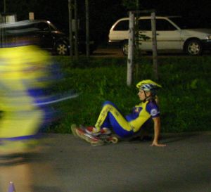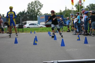 Die Schlange war sehr lang, als es zuerst an den Geschicklichkeitsparcours ging. Die „Schallmauer“ von 22 Sekunden erwies sich als eine gute, denn selbst die noch 5 jährigen rollten exakt in der Zeit über die Ziellinie, wo die schnellsten grade mal 9 Sekunden benötigten. Alle waren glücklich und motiviert nun die Kurzstrecke über 50 m anzugehen. Hier war die Vorgabe 16 Sekunden für die einfachste Stufe. Die Kinder schafften hier zwischen 8 und 16 Sekunden und hatten die nächste Hürde geschafft. Zwei der drei Stempel waren nun sicher und auch der letzte sollte geschafft werden, wenn es über die Langstrecke von 200 m zu rollen galt. 13 km/h ist die Vorgabe, was 55 Sekunden entspricht. Immer vier durften starten und versuchen die Zeitbarriere zu schaffen, die nicht selten knapp war und nur durch die Anfeuerungsrufe der Eltern und Gäste machbar.