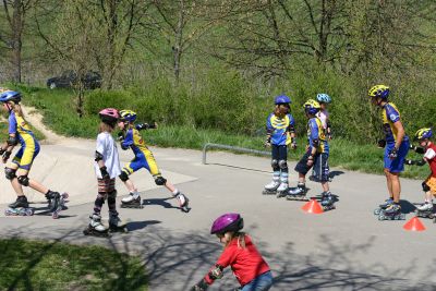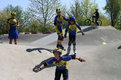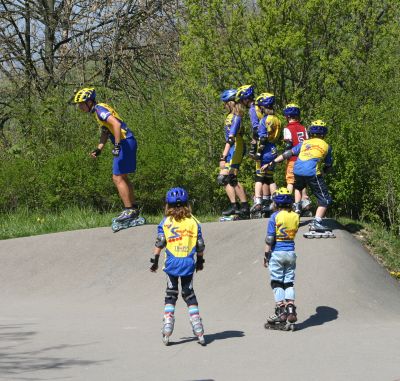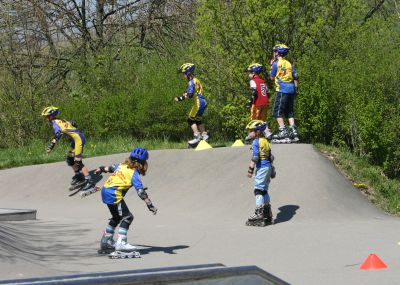Zweimal die Woche findet das Training des Skatevereins seit Ende des Hallentrainings wieder im Freien statt. Neben dem üblichen Training wo es auf Technik, Sprint und Ausdauer ankommt wollen die Trainer den Kindern auch die Vielseitigkeit und auch den Spaß auf den Rollen zeigen. Denn wer sowohl eine gute Ausdauer hat und auch die Technik beherrscht ist ein gute Skater und dafür ist eine ganze Menge Körperbeherrschung und Balance notwendig. Diese lernt man mit Spielen und Übungen aber am einfachsten in einem Skatepark. Wer es schon mal probiert hat auf Rollen über eine Bodenwelle zu skaten weiß wie leicht man da aus dem Tritt kommt. Unter Skatern sagt man „die Mitte finden“. Dabei geht es darum alle Rollen gleich zu belasten und weder nach vorn noch nach hinten zu kippen und den Schwerpunkt mittig zu halten, denn da liegt der Schlüssel für eine sichere Haltung.