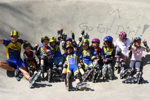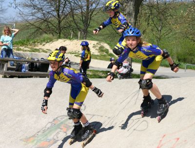 Bild: Nicht alle können schon so flott durch den Skatepark flitzen wie Eyleen Richter, Franziska Baur und Anna Kühne, aber mit jeder Menge Spaß lernen das die Kinder des Speedteam-Bodensee rasend schnell.