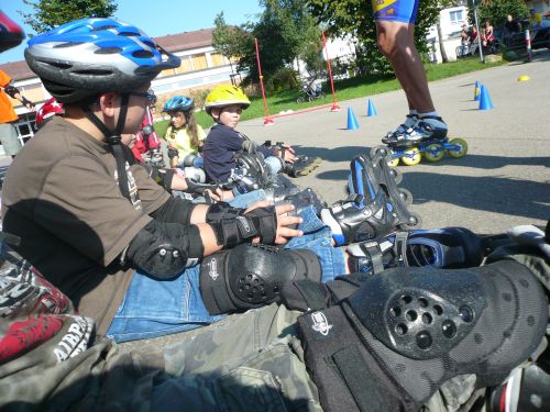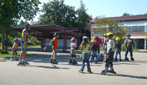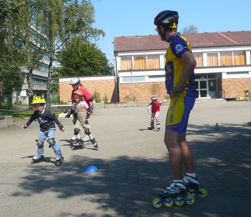 Eine bunt gemischte Gruppe von 25 Kindern hat sich am Samstag auf dem Schulhof in Ailingen mit den Trainern des Speedteam-Bodensee Andreas Titze, Maik Scholl und als Hilfe Franziska Baur getroffen. Von der Skatepostion bis zum Geschicklichkeitsparcours wurde alles geübt, was einen jungen Skater auf Skates sicher macht.