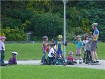 Beim Bremsen hatten viele Kinder ihre Probleme, wobei Cornelius Droop vom Speedteam-Bodensee größeren Wert auf die sichere Skate-Position, das Beherrschen von Ausweichmanövern und auch auf das sturzfreie Hineinfahren in die Wiese legte. Denn in der Not fällt man im Gras verletzungsärmer als auf dem harten Asphalt. Auf den Skates rückwärts zu fahren war ebenso für viele nicht einfach.