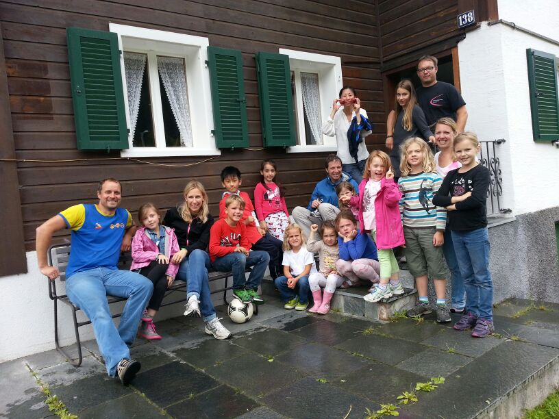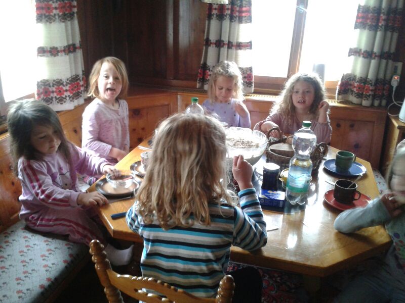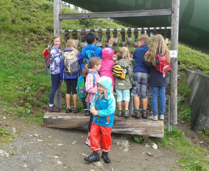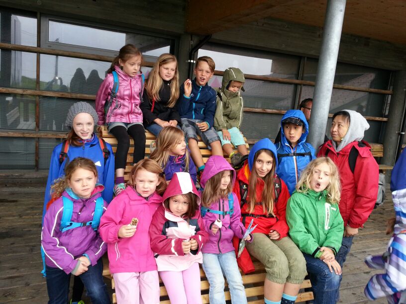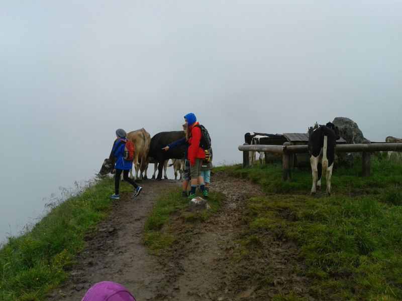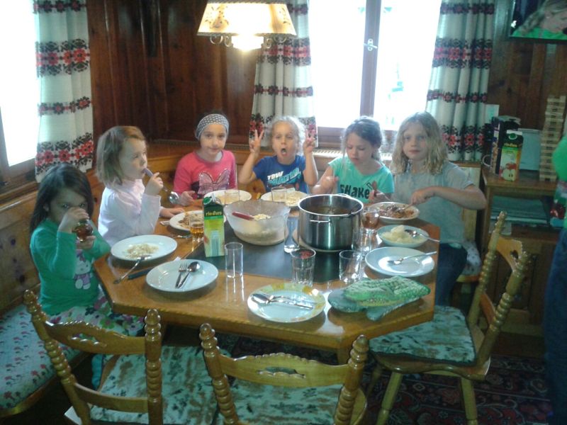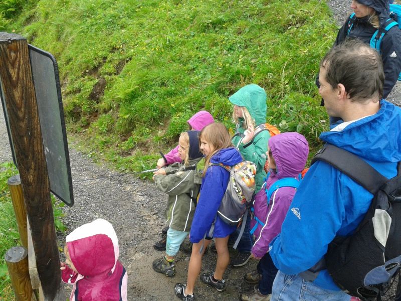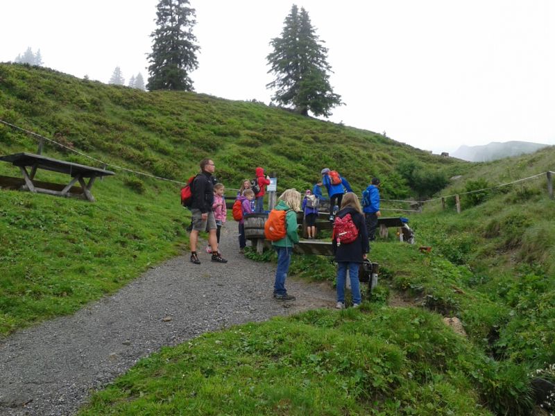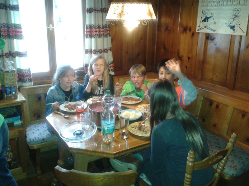 Das trübe Wetter am Samstag morgen konnte uns nicht daran hindern am Programm festzuhalten. Mit Müsli und Brot gestärkt ging es wie geplant auf den Golmi-Pfad. Mit der Gondel auf die Golm und auf dem Erlebnispfad stetig bergab Richtung Mittelstation. Dass es nass war und immer wieder nieselte tat der Stimmung keinen Abbruch und die Stationen auf dem Weg waren abwechslungsreich und ehe man sich versah war man zwischen den Kühen durch fast wieder am Ende. Nach einer Stärkung mit Wurst, Käse, Gemüse und Brot überdacht in einer Liftstation ging es wieder in die Gondeln zurück ins Tal. Das Wetter wurde immer besser und nach dem Besuch im Indoor-Spielplatz wurde nach draußen in den Erlebniswald umgezogen. Dort nahm man die Grillstelle in Besitz und verlegte das Grillen als Abendessen vor. Endlich wieder in der Hütte wurde erstmal Pause gemacht und jeder konnte sich im Zimmer ausruhen. Zum späten Nachtisch gab es noch Schokofondue mit frischem Obst. Das Einschlafen klappte nach dem anstrengenden Tag besser.