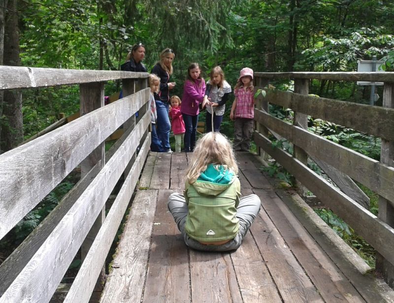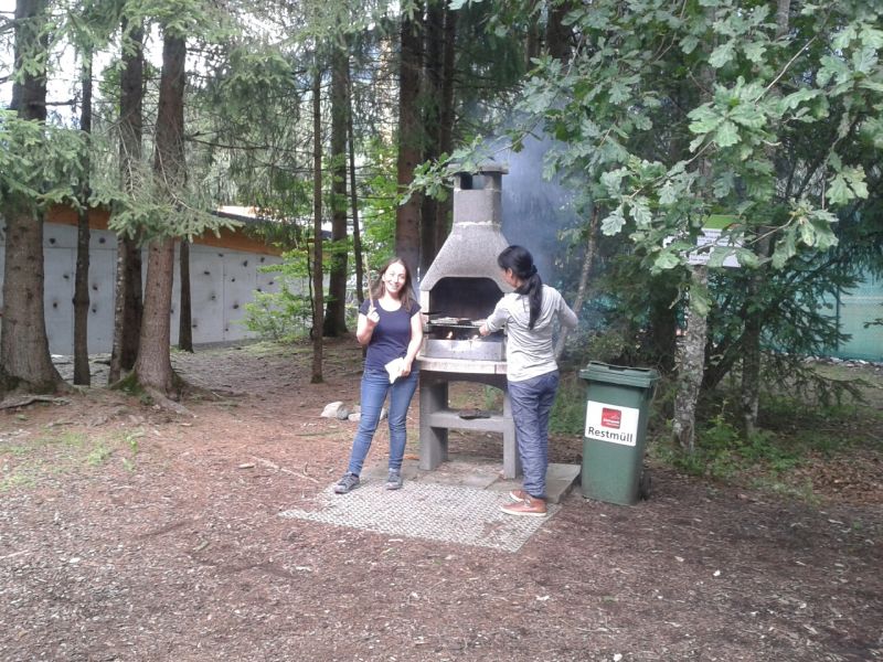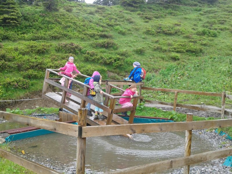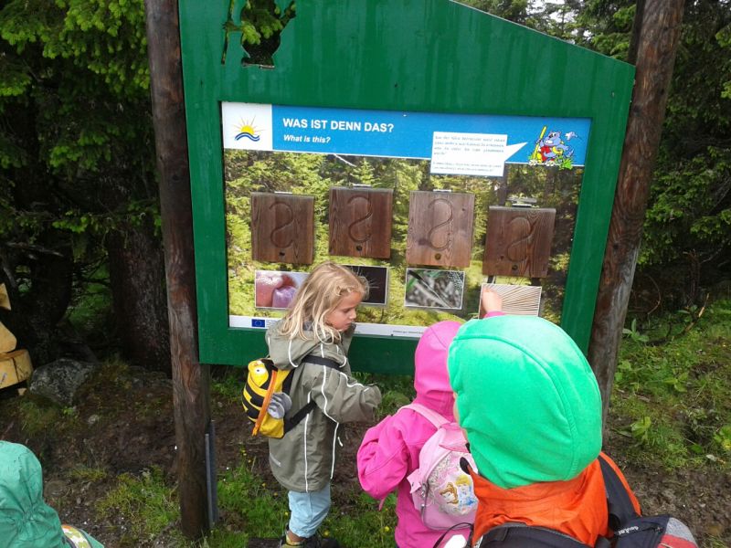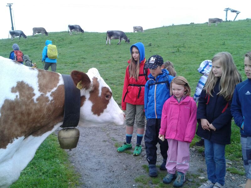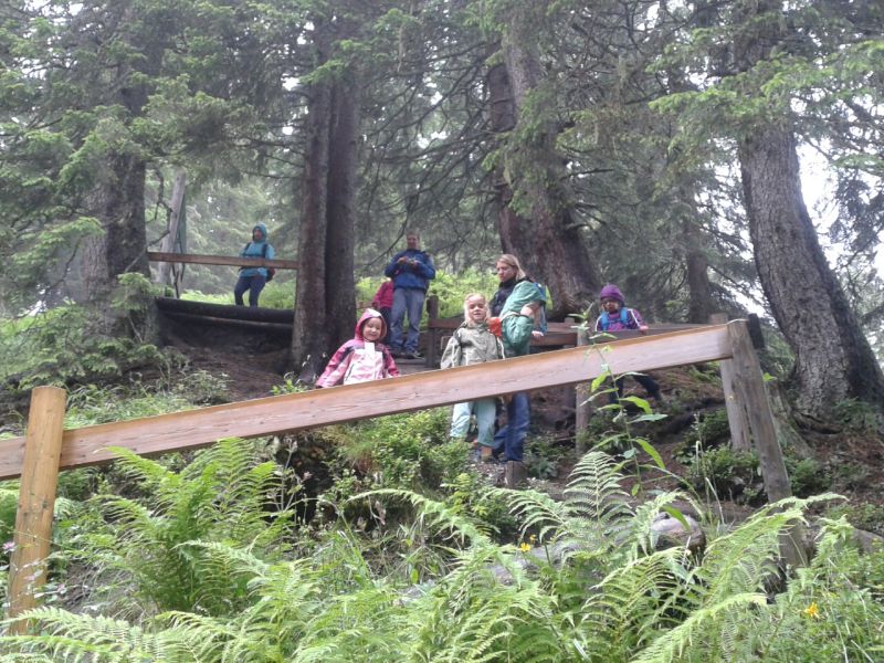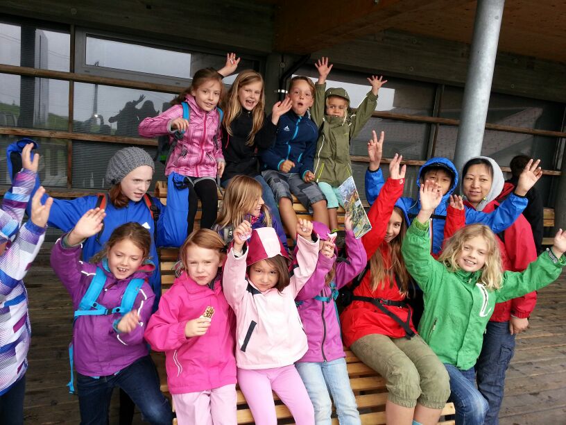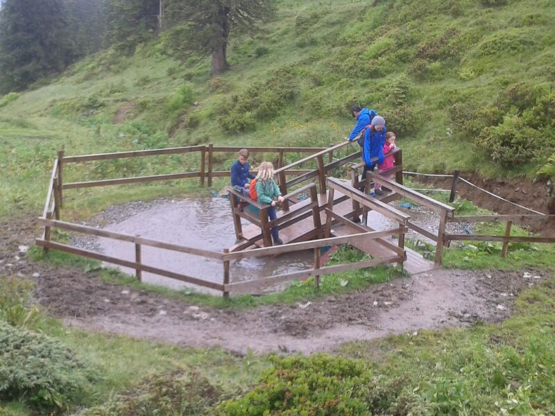 Das trübe Wetter am Samstag morgen konnte uns nicht daran hindern am Programm festzuhalten. Mit Müsli und Brot gestärkt ging es wie geplant auf den Golmi-Pfad. Mit der Gondel auf die Golm und auf dem Erlebnispfad stetig bergab Richtung Mittelstation. Dass es nass war und immer wieder nieselte tat der Stimmung keinen Abbruch und die Stationen auf dem Weg waren abwechslungsreich und ehe man sich versah war man zwischen den Kühen durch fast wieder am Ende. Nach einer Stärkung mit Wurst, Käse, Gemüse und Brot überdacht in einer Liftstation ging es wieder in die Gondeln zurück ins Tal. Das Wetter wurde immer besser und nach dem Besuch im Indoor-Spielplatz wurde nach draußen in den Erlebniswald umgezogen. Dort nahm man die Grillstelle in Besitz und verlegte das Grillen als Abendessen vor. Endlich wieder in der Hütte wurde erstmal Pause gemacht und jeder konnte sich im Zimmer ausruhen. Zum späten Nachtisch gab es noch Schokofondue mit frischem Obst. Das Einschlafen klappte nach dem anstrengenden Tag besser.