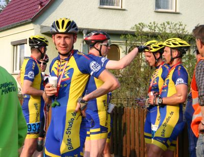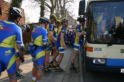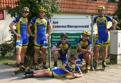 Am Nachmittag packten wir dann mit schon "warmen" Muskeln unser Zeug für die 10 km im Spreewald. Ein Proberennen eigentlich. Nach fast 1,5 Stunden Fahrt kamen wir dann auch in der Pampa an, denn die Bewohner waren weder Skater noch Busse gewohnt und so waren wir in blau gelb auch recht auffällig. Die 10 km waren dann doch etwas über dem Trainingspuls und auch Olli kam auf seine Kosten und den 2. Platz gesamt. Simone hatte zwischen den Männern nicht so große Mühe und sprintete erstklassisch auf den ersten Platz der Frauen.
