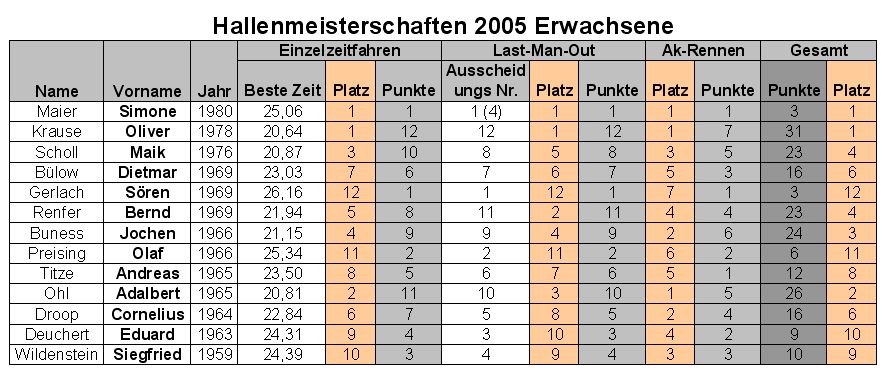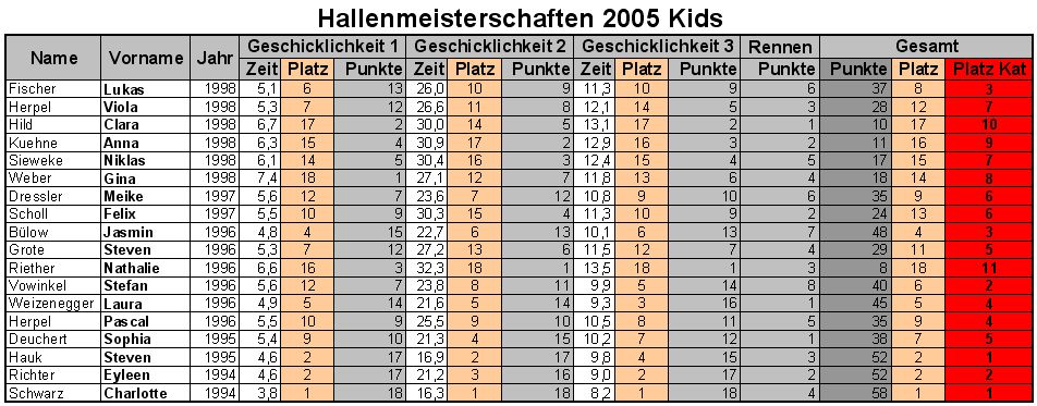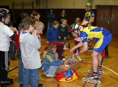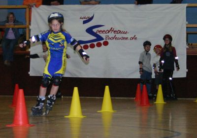 "Die Hallenmeisterschaften 2005 waren vor allem mit den Kindern ein voller Erfolg. Fast alle jungen Mitglieder waren zu dem Abend gekommen um schon ab 18:30 zu zeigen, was sie auf den Rollen drauf haben. Bei 3 Geschicklichkeitsparcourse und einem Rennen konnten die Kleinsten Ihre Punkte sammeln. Am Ende wurde dann alles zusammengezählt und jeder konnte eine Urkunde mit nach Hause nehmen und auch noch ein kleines Geschenk.