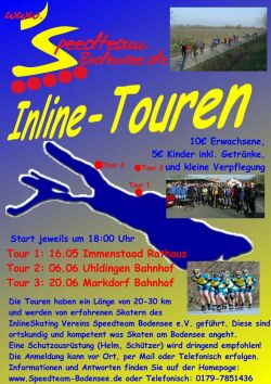 "Plakat für unsere geführten Touren!Wer die Möglichkeit hat zu drucken, soll das tun undsie verteilen!Allgemein und BodenseeumrundnungUnd hier die druckbaren Versionen zum Runterladen:TourenTrainingAllgemeinBodenseeWilhelmsdorfIst natürlich bessere Qualität und deshalb auch größer.ca. 250 KB für eine DIN A4 Seite."