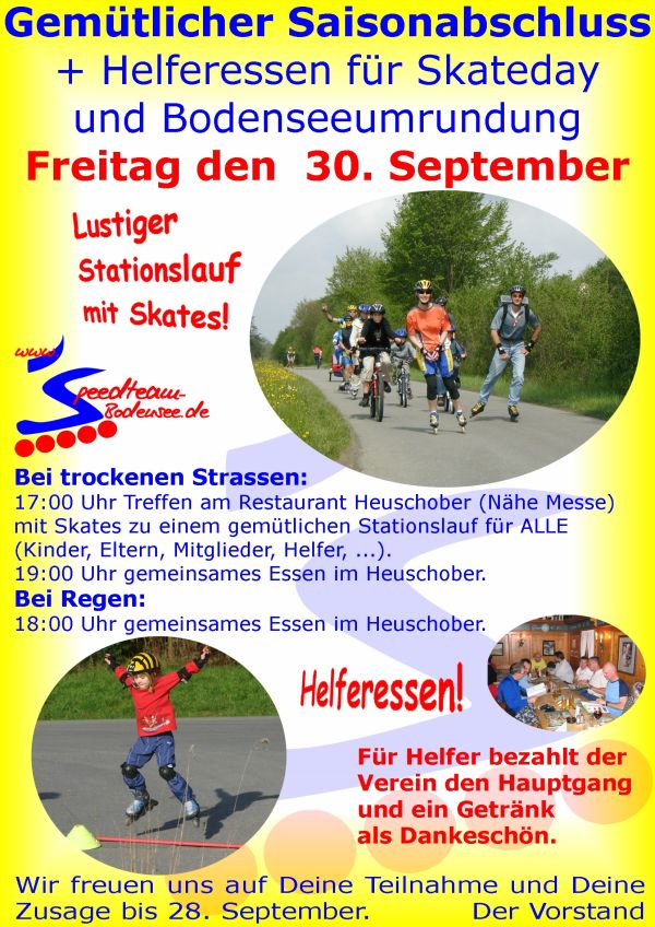 Am Freitag den 30. September laden wir alle Mitglieder und Helfer vom Skateday und bei der Bodenseeumrundung (kommt noch am 25. September) zu einem gemeinsamen Abschluss fest und bedanken uns bei einem Essen im Heuschober und einem tollen Stationslauf auf Skates, wenn die Strassen trocken bleiben.