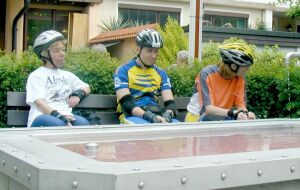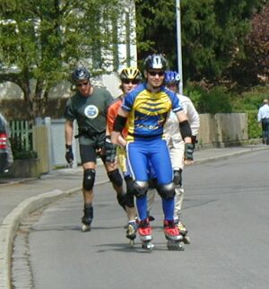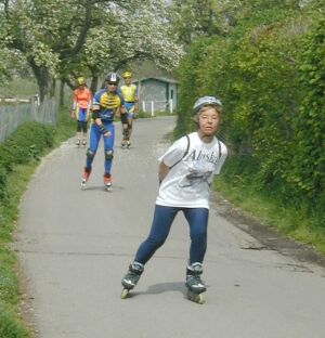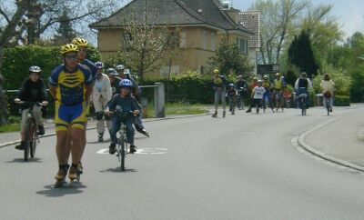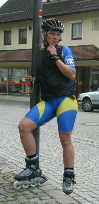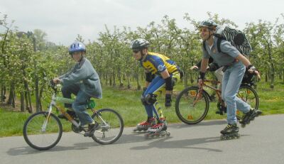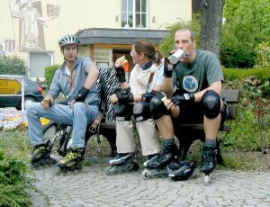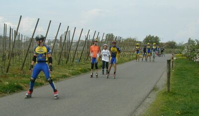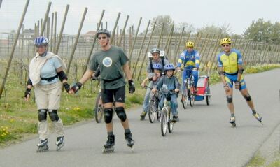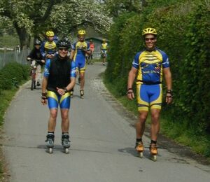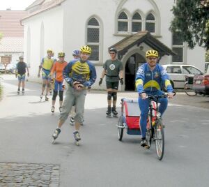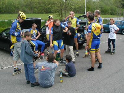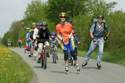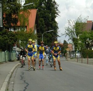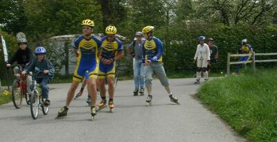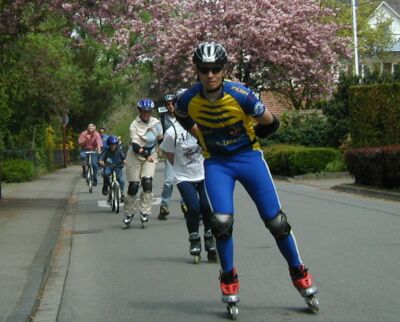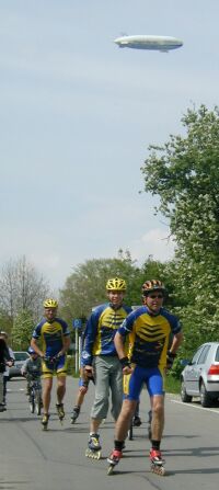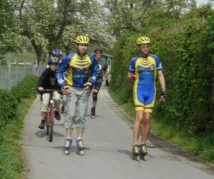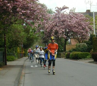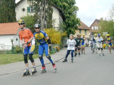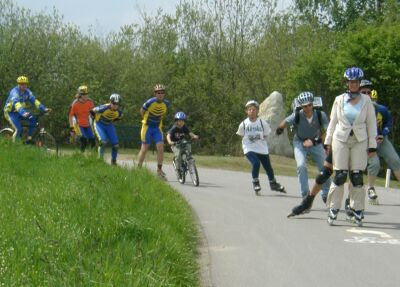 "Es stand kein Training, keine Geschwindigkeit im Vordergrund, stattdessen der gemeinsame Spaß am Skaten und eine Vereinsveranstaltung, an der man sich 'mal wieder sieht'. So machten sich ca. 12 Vereinsmitglieder auf, um gemeinsam am See entlang zu skaten. Nur eine mußte 'arbeiten': Kerstin hat ein härteres Intervalltraining hinter sich, um gute Fotos zu erhaschen. Die Kids waren entweder mit dem Fahrrad oder noch bequemer im Radanhänger unterwegs.