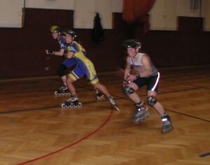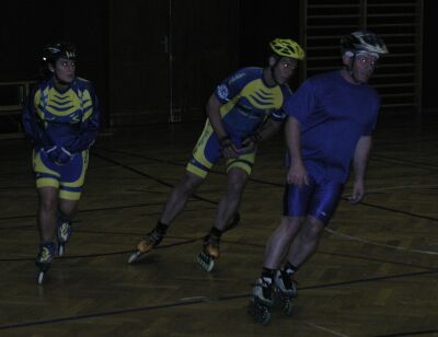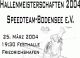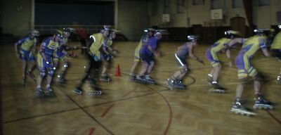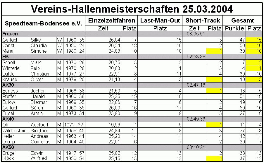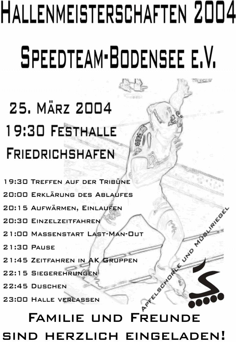"Zeitungsartikel:Der Inline-Skating Verein Speedteam-Bodensee e.V. hat über den Winter wöchentlich in der Festhalle in Friedrichshafen trainiert um für die Saison seine Technik zu verbessern. Im Fordergrund standen vor allem die Kurventechnik und die Überwindung der Berührungsangst in der Gruppe. Als Abschluss des Hallentrainings wurde vom Verein eine interne Meisterschaft ausgetragen um das über den Winter erlernte praktisch anzuwenden. Der erste Teil der Meisterschaft war ein so genanntes ShortTrack Rennen. Gefahren wurde auf einem kleinen Oval von der Größe der Sporthalle, wie es vom Eislaufen her bekannt ist. Es geht dabei rasant um die Kurven und es ist nicht nur wichtig schnell zu skaten, sondern sich taktisch so zu platzieren, dass für den Zieldurchlauf eine gute Ausgangslage geschaffen wird und noch so viel Kraft zu sparen, damit ein Sprint noch möglich ist. Um die Teilnehmer in Gruppen aufzuteilen wurde in Einzelzeitfahren gemacht, bei dem jeder Skater 3 Runden auf Zeit fahren musste. Aus diesen Ergebnissen wurden wiederum Gruppen gebildet, die anschließend im ShortTrack die Platzierungen ausfuhren. Dabei war hohe Spannung geboten, da die Skater im Zieldurchlauf nur wenige Sekundenbruchteile auseinander lagen und nicht nur einmal das Rennen in der letzten Kurve entschieden wurde. Im Finale der Altersklasse über 40 konnte sich Eduard Deuchert in einem knappen Finale gegen Ludwig Bender durchsetzen und somit den ersten Title als Vereinsmeister gewinnen. Das Finale der Hauptklasse erreichten Cornelius Droop, Maik Scholl und Felix Winterle. Nach 10 Runden konnte sich der auf der Bahn erfahrene Neuzugang Felix Winterle gegen Maik Scholl in einem knappen Sprint behaupten und nahm den Titel als Vereinsbester mit nach Hause. Im zweiten Teil der Vereinsmeisterschaft wurde wieder in die Klassen über und unter 40 Jahre aufgeteilt und das Rennen im Last-Man-Out ausgetragen. Wie der Name schon sagt ist der Letzte raus. Das bedeute die gesamte Gruppe startet auf dem Oval und alle 10 Runden ist eine Wertungsrunde in der an der Ziellinie der Letzte ausscheiden muss, wobei die restlichen Skater weiterfahren. Alles wurde hier auf die Wertungsrunde ausgelegt und für den kurzen Sprint taktiert. Auch hier war es stets eng, da der Windschatten genutzt und Kraft gespart wurde. In der Klasse über 40 konnte sich abermals Eduard Deuchert seinen zweiten Titel sichern und nach 40 Runden Siegfried Wildenstein, Ludwig Bender, Rene Jacob und Wilfried Klöck auf die Plätze verweisen. In der Klasse unter 40 wurde es lediglich um die hinteren Plätze knapp da sich Felix Winterle mit seiner langjährigen Bahnerfahrung und technischen Überlegenheit bald vom Feld absetzen und auch diesen Titel gewinnen konnte. Die Plätze dahinter belegten Maik Scholl, Cornelius Droop, Arthur Streich und Andreas Konrad in dieser Reihenfolge Mit dieser Veranstaltung kann der Verein auf ein erfolgreiches Wintertraining in der Halle zurückblicken und jetzt schon enorme Leistungssteigerungen seiner Mitglieder feststellen. Das Training geht nun jeweils dienstags und donnerstag um 18:30 Uhr am Dehner Gartencenter in Friedrichshafen Ost im Freien weiter. Jede sportliche Skaterin und jeder sportliche Skater ist gern im Verein und beim Training willkomme Bericht: 1) Indoor Short-Track 2) Ausscheidungsrennen über 40 Runden Leider waren keine Damen am Start, dafür wurde die Vereinsmeisterschaft bei den Herren in zwei Alterklassen ausgetragen • Männer Hauptklasse und AK 30 • Männer AK 40 und älter Die 10 Teilnehmer, die sich zum Abschluß des Winter-Hallentrainings nochmal sportlich messen wollten hatten Spass und gute Laune, wobei der vorhandene Ehrgeiz bei rasanter Kurvenfahrt doch dem einen oder anderen gelegentlich die Haftungsgrenze der Rollen aufzeigte. Ergebnisse: Männer AK 40 und älter Männer Hauptklasse und AK 30 Short-Track: 1. Siggi Wildenstein 1. Felix Winterle 2. Eddi Deuchert 2. Maik Scholl 3. Ludwig Bender 3. Cornelius Droop 4. Wilfried Klöck & Rene Jacob 4. Arthur Strei 5. Andy Konrad Ausscheidungsrennen: 1. Eddi Deuchert 1. Felix Winterle 2. Ludwig Bender 2. Maik Scholl 3. Siggi Wildenstein 3. Cornelius Droop 4. Wilfried Klöck 4. Arthur Streich 5. Rene Jacob 5. Andy Konrad Zum Verlauf: Zunächst wurde ein Einzelzeitfahren über 3 Runden ausgetragen, um die Besetzung der Vorläufe zu ermitteln. Schon hier kam es zu der ein oder anderen Überraschung. Bei der AK 40> war Siggi mit einer Zeit von 37,8 sec. der Schnellste, Ludwig dann doch eher unerwartet mit 38,8 sec. noch vor Eddi (39,0 sec.). Bei den ""Jüngeren"" konnte sich Maik (31,5 sec.) vor Felix (32,0 sec.) durchsetzten, womit nicht unbedingt zu rechnen gewesen war. Allerdings hatte es Felix gleich in 2 Kurven ordentlich ""versetzt"". Dahinter Cornelius mit 33,8 sec. Eine weitere Überraschung: Andy mit 35,0 sec. äußerst knapp vor Arthur mit 35,1 sec. (alle Ergebnisse handgestoppt). Aber diese Zeiten hatten ja nichts zu sagen, in den folgenden Läufen über 5 Runden galt es, sich für das Finale im Short-Track zu qualifizie en. Jeweils der Sieger und der zeitschnellste Zweitplatzierte erreichte das Finale. Sieger der Vorläufe waren Siggi, Eddi sowie Maik und Felix. Weiterhin qualifizierten sich über die Zeit Ludwig in der AK 40> und Cornelius bei der HK/AK 30. Der vierte Platz bei den ""Jüngeren"" wurde in einem kleinen Finale über 10 Runden zwischen Arthur und Andy ausgetragen und blieb spannend bis zur letzten Kurve. Arthur hatte Andy die ganze Zeit über führen lassen, einen früheren Angriff hatte Andy erfolgreich abwehren können, aber mit einem entscheidenen Antritt schaffte Arthur es schließlich eine Schrittlänge voraus zu sein. Siggi konnte sich in der AK 40> mit einem gewagten Zwischensprint zur Hälfte des Rennen an Eddi vorbei an die Spitze setzten, welche er in der Folge nicht mehr abgab. Da es bei diesem Manöver äußerst knapp und mit Körperkontakt zuging, musste sich das Schiedsgericht kurz miteinander beraten, sah