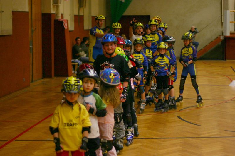 Die Mischung aus Spielen und Technikübungen kam gut an und so merkten die Kinder kaum, wie lang sie schon auf den Rollen in der Halle „rumwuselten“. Für die Kleinen wurden zwischendurch Pausen gemacht, wobei sich die älteren Kinder auch mal mit den Trainern messen durften.