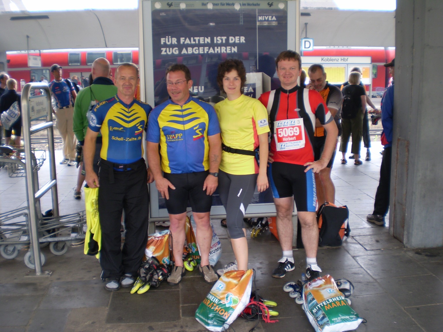 Am 31.05.08 starteten die Speedskater Robert Berndt (1:26:33 ), Steffi Marx (1:26:07), Siegfried Wildenstein (1:20:41 ) und Herbert Schuller (1:30:18 ) in Koblenz über 42 km Gestartet wurde in Oberwesel entlang am Rhein nach Koblenz.. Gestartet wurde in Vier Blöcken. Robert Berndt fuhr in seinem Block mit an der Spitze. Nach 15 Minuten löste ein Skater vor ihm einen Massensturz aus. Dabei zog er sich dabei eine Knieverletzung Prellungen und mehrere Schürfverletzungen zu. Trotz der Verletzungen beendete er das Rennen in seiner bisher schnellsten Zeit. Steffi Marx verbesserte sich ebenfalls sowie Herbert Schuller. Siegfried Wildenstein war somit schnellster vom Speedtem-Bodensee.