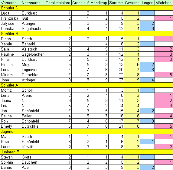 Beim diesjährigen Hallenabschluss sollte das Programm mal ein wenig geändert werden, als im Vergleich zu den vergangenen Jahren. Aus diesem Grund begann man mit Parallelslalom. Ab Schüler B auch mit Wechsel auf rückwärts. Da ein K.O.-System oft etwas unfair sein kann, entschied man sich für einen Wettkampf bei dem jeder gegen jeden antrat, allerdings um Zeit zu sparen bei Schüler B und A in Gruppen bis max. 4-5 Teilnehmer als Vorläufe und einem Finale der jeweils 2 Besten.