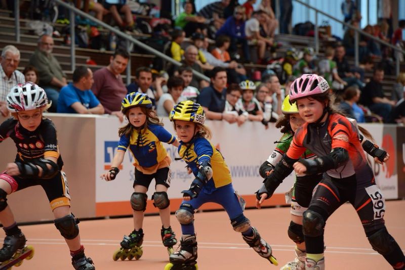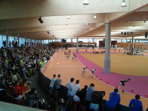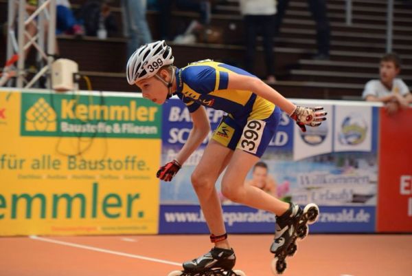 Der Samstag stand im Zeichen der Schülerklassen bei denen die Kinder von 5 – 15 Jahre drei Wettkämpfe absolvieren mussten. Ein langer Tag stand den Kindern bevor denn die ersten Rennen starteten über die Kurzstrecken bereits um 9:00 Uhr morgens. Im ersten Lauf des Tages starteten die jüngsten bis 7 Jahre. Sara Scholl und Jana Buness vom Speedteam-Bodensee mussten 300m, also 1 ½ Runden, in der riesigen Halle absolvieren. Nachdem Sara den ungewöhnlichen Startschuss aus der elektronischen Pistole verpasst rollte sie das Feld von hinten auf und hätte um wenige cm sogar den 3. Platz erreicht. Nach und nach folgten so die Alterklassen aufsteigend bis zu den Erwachsenen für den ersten Wettkampf von drei. So hatte als nächstes Luca Burkhard sein Rennen bei den Schülern C über 500m mit Platz 10. Dinah Speth und Marco Grittner bei den Schülern A mit jeweils einem 20. Platz in der Internationalen Konkurrenz über die Kurzstrecke. Das größte Starterfeld hatte der Verein in der Klasse Kadetten der 13/14 Jährigen. Mit Lena Arens, Ron und Jan Schönfeld, Julian Kühne und Moritz Scholl starteten hier die Leistungsträger des Vereins. Alle stellten sich also der internationalen Konkurrenz was an sich schon eine beachtliche Leistung ist. Eine fordere Platzierung war nur von Moritz Scholl zu erwarten, der nationale Spitze in der Klasse ist. Mit Respekt ging er in seinem ersten Rennen über 3000m an den Start und versuchte in dem 40 Jugendlichen großen Startfeld seinen Platz zu finden und kam als 9. ins Ziel. Um einen Wimpernschlag verpaßte er dann das Finale der besten 5 über 200m und zeigte seine Stärke über die kurzen Strecken.