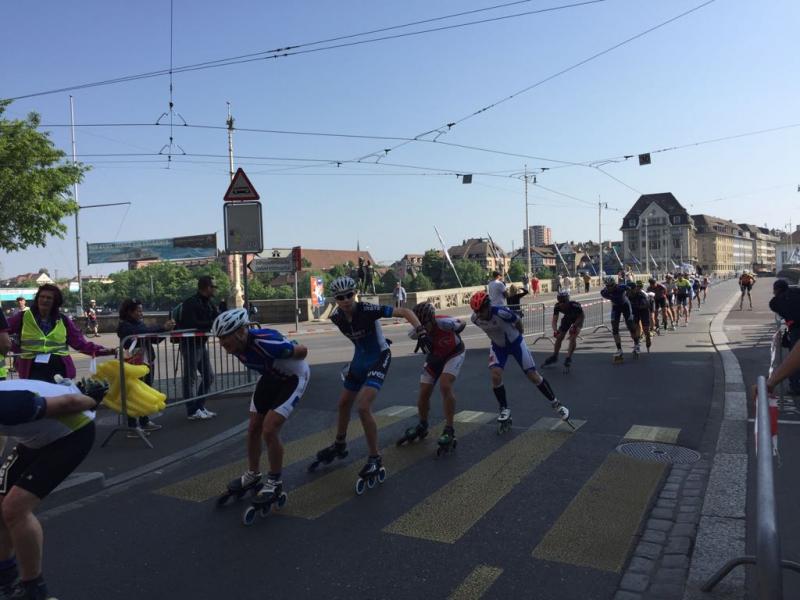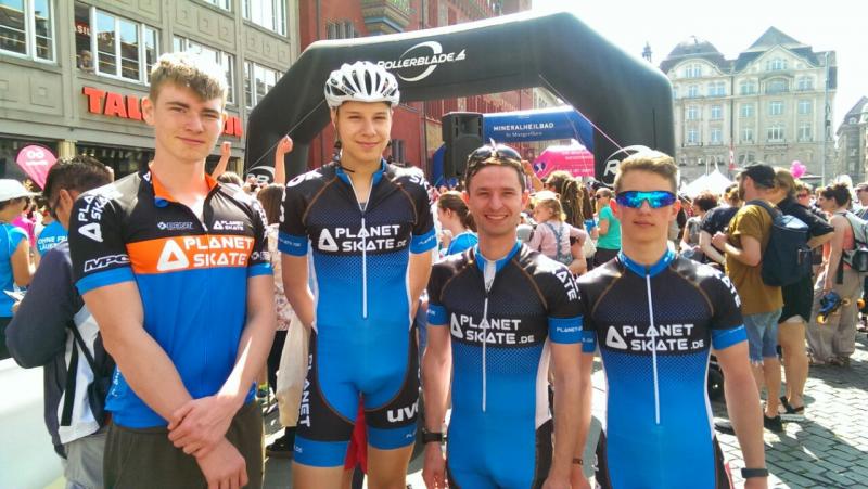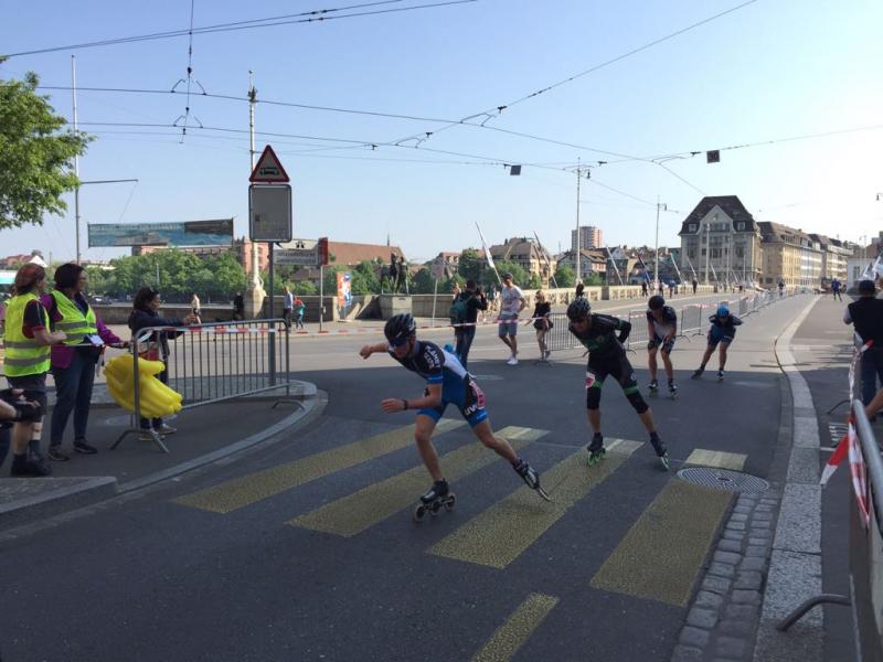 War Frankfurt mit 53km ein Stück länger als der übliche Marathon, so sparte man sich diese Strecke auf den 32km in Basel. Mit einem langen Anstieg, zwei Rheinquerungen und ein paar engen Kurven, die unter Nutzung des Gehweges aber durchaus gut fahrbar waren, war der 6km lange Rundkurs durch die Basler Altstadt beidseits des Rheins aber nicht minder selektiv. Für das Speedteam-Bodensee gingen Marco, Ron, Julian und Sebastian an den Start für das Rennteam Planet-Skate.de pb Bont. Unglücklicherweise kam Marco im Startgetümmel ins straucheln und Ron könnte nicht ausweichen. Im direkt folgenden Anstieg, beidseitig mit Pylonen gesäumt, gelang es den beiden nur schwerlich die verlorenen Plätze wieder wett zu machen. Sebastian hatte mehr Glück und hielt sich zu Beginn in der Spitzengruppe mit Spitzenathleten aus der Schweiz, Frankreich und Indonesien. Dann sprengte sich das Feld und mit Matthias Schill und Mike Kohler waren seine üblichen Konkurrenten im BWIC mit ihm in einer Verfolgergruppe versammelt. Der Rest des sonnigen Rennens verlief wenig spektakulär, leider hatte er im Zielsprint dann nicht die schnellsten Rollen und Beine. Kurz darauf liefen auch Marco, sowie in der nachfolgenden Gruppe Julian und Ron ins Ziel ein.