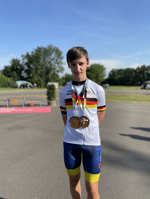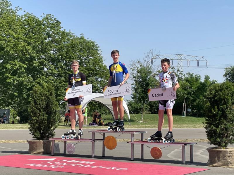 Aus Friedrichshafen war der 14-jährige Maurice Marosi für das Speedteam Bodensee am Start. Er war Teil eines 16-köpfigen Starterfelds bei den Kadetten Jungen. Insgesamt gab es drei Deutsche Meistertitel auf folgenden Strecken zu vergeben: 200m Sprint Verfolgung, 800m, 3000m Punkte. Für die 200m und 800m galt es sich zunächst in den Vorläufen für das Finale zu qualifizieren. Mit 19,1 Sekunden absolvierte Maurice den Vorlauf über 200m mit Bestzeit. Im Finale über diese Distanz stand er zusammen mit Manuel Eppinger aus Großbettlingen. Die beiden stärksten Sprinter in dieser Altersklasse lieferten sich ein enges Finale, was Maurice mit 19,34 Sekunden für sich entschied und sich somit den ersten Titel sicherte. Im Vorlauf über die 800m wurde Maurice stark gefordert, denn die Konkurrenz schlug ein hartes Tempo vom Start weg an. Dennoch gelang es ihm sich für das Finale zu qualifizieren. Den Finallauf absolvierte er taktisch klug und zog 400m vor Ziel den Sprint an, dem keiner seiner Konkurrenten folgen konnte. Mit 1:21,078 Minuten konnte sich der Skater vom Bodensee den zweiten Deutschen Meistertitel sichern. Die Abschließenden 3000m wurden im Punkte Modus gefahren wo die Taktik sowie eine gute Renneinteilung der Schlüssel zum Erfolg ist. Maurice Marosi kontrollierte das Feld von Anfang an. Er war in jeder Punktevergabe mit dabei und hielt sich in der ersten Rennhälfte an Position zwei im Windschatten. Auf den letzen tausend Metern übernahm der die initiative und sicherte sich die entscheidenden Punkte für den dritten Meistertitel für das Speedteam Bodensee. Somit stand er auch als Sieger der Gesamtwertung in seiner Altersklasse fest und durfte sich das Trikot mit dem Schwarz-Rot-Goldenen Brustring überstreifen.