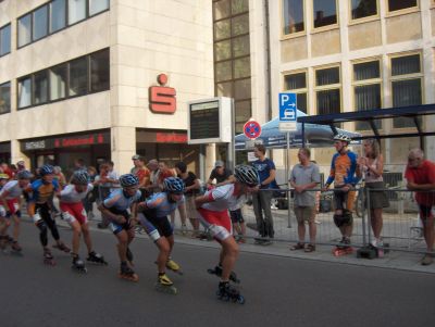 Doch auch hier fand sich schon in den ersten der 20 Runden eine schnelle Spitzengruppe von ca. 10 Skatern. Ab der 3 Runde wurden immer wieder Ausreißversuche gestartet aber Sebastian konnte sich in der Gruppe halten. Nachdem das Rennen um Runde 15 etwas langsamer geworden war wurden die letzten beiden Runden gesprintet was das Zeug hielt. Bei der letzten Zieldurchfahrt konnten sich 2 Skater vom Rest der Gruppe absetzen, gefolgt von Sebastian. Auf der Gegengerade konnte dieser den Abstand jedoch konstant auf wenige Meter halten und wurde nur von 2 Skatern eingeholt. Im Schlusssprint sicherte er sich dann durch eine Zielkrätsche den dritten Platz im B-Finale.
