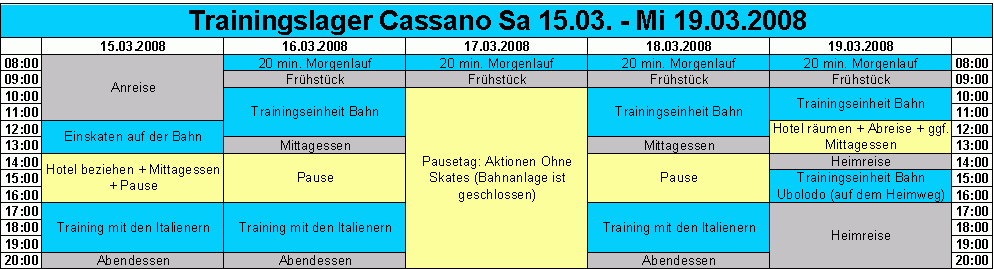 Auch 2008 wollen wir wieder ein gemeinsames Trainingslager machen auf der super Bahnanlage in Cassano mit dem italienischen Skateverein von dem wir noch viel lernen können. Ziel ist es natürlich gut zu trainieren, die Technik zu verbessern aber auch eine gemeinsame tolle Zeit zu haben. Der Termin ist diesmal schülerfreundlich gewählt, so dass die etwas älteren Kinder (älter als 10 Jahre) auch mitkönnen.