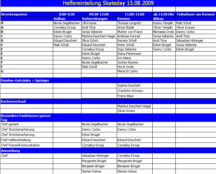 Bitte jeweils mindestens 15 Minuten vor der Einsatzzeit da sein!